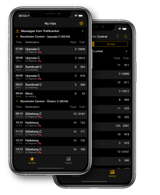Tågkoll is for people commuting by train in Sweden. By saving your frequent destinations you get access to a personalized train schedule and information about any delays. You can also check arrivals, departures and other traffic information for a given station.